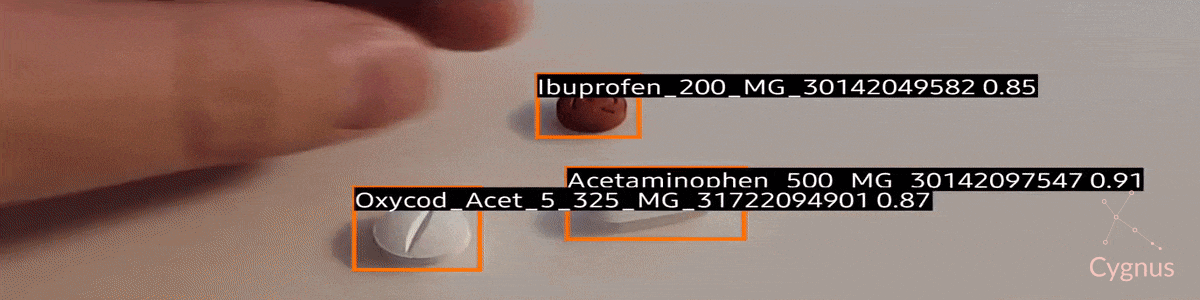 Cygnus® Medication Identification Technology is a suite of machine learning object identification models for pharmaceutical pill identification. Trained from a dataset of hundreds of thousands of high-quality images, these models deliver high accuracy and performance, and each training image is associated with a full, 11-digit NDC number. The models can be customized to provide predictions for subsets of drugs, according to your needs, i.e. opioids, psychotropics, antibiotics, etc., or for the full set of currently available drugs.